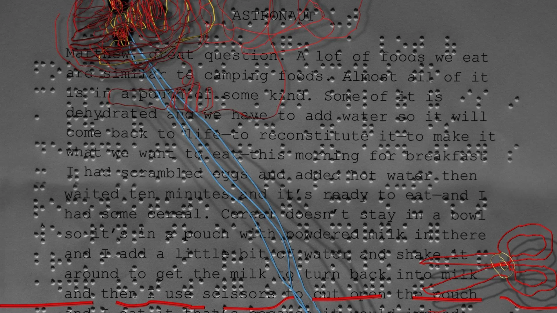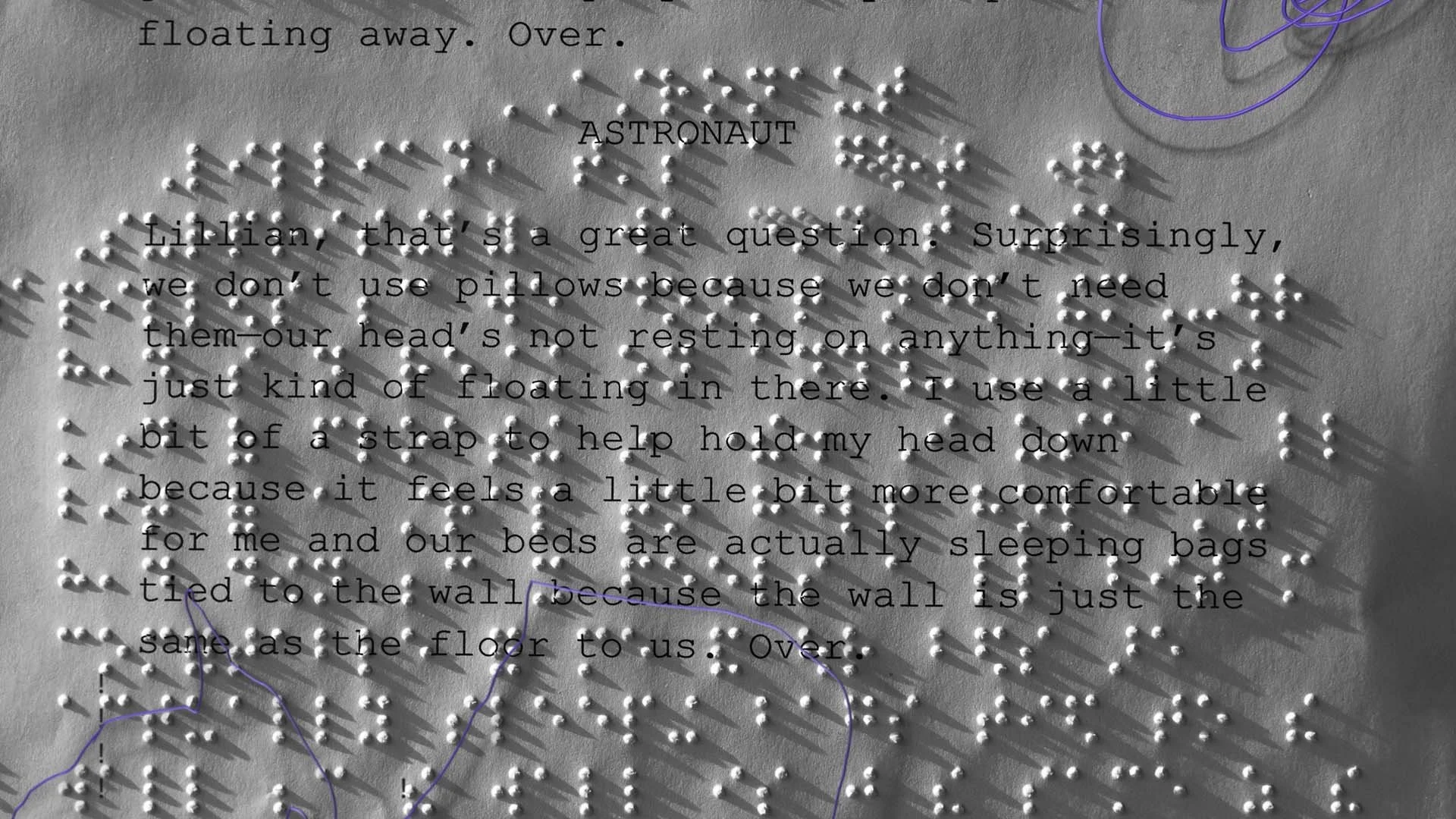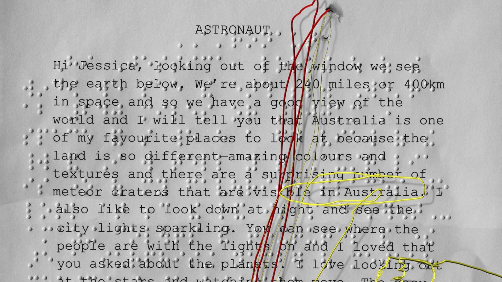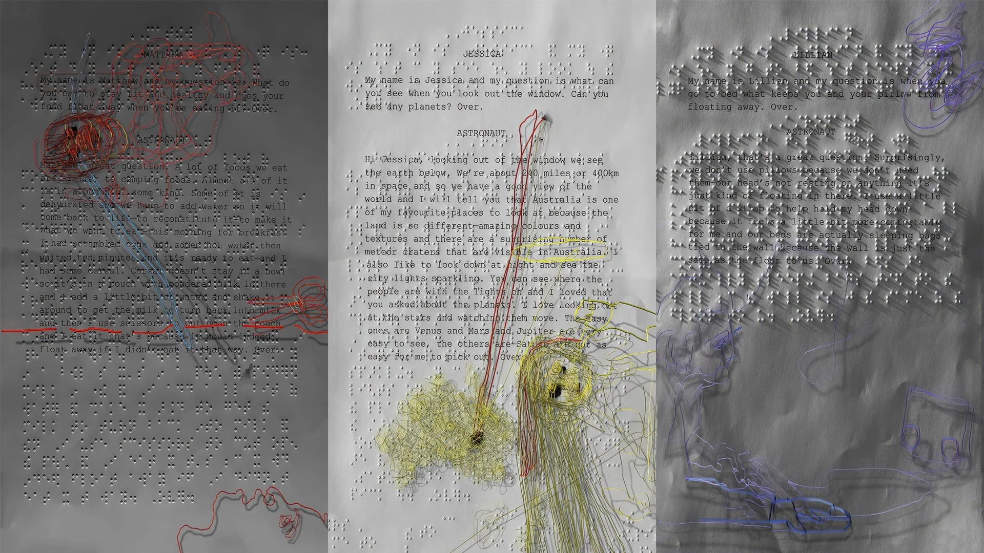 The dialogue is derived word for word from a live radio interview between vision-impaired Australian children and an American astronaut residing on the international space station that was broadcast in 2011.