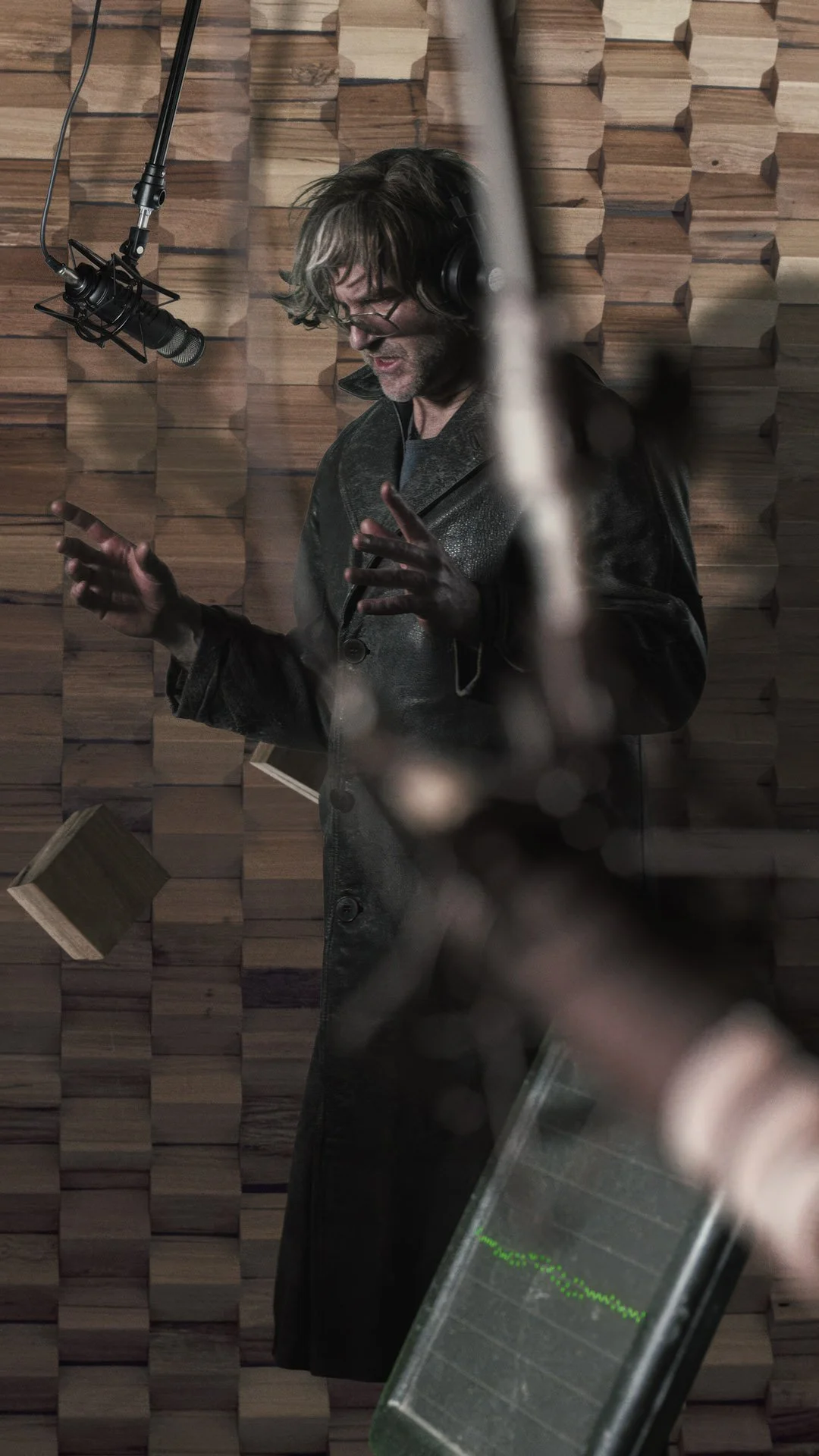 As an infinite loop, the image features a solitary figure within an imaginary soundproofed studio setting engaged in lip-syncing to the original transmission, moving as it were, against the grain of his own voice.